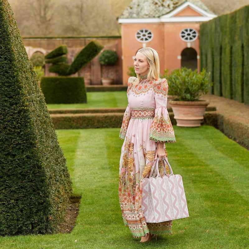 Our exclusive Mrs. Alice Tote Bag comes in a stylish Pink Ikat stripe.