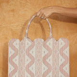 Chic and scalloped, this elegant and spacious tote is made with sturdy and structured woven fabric.