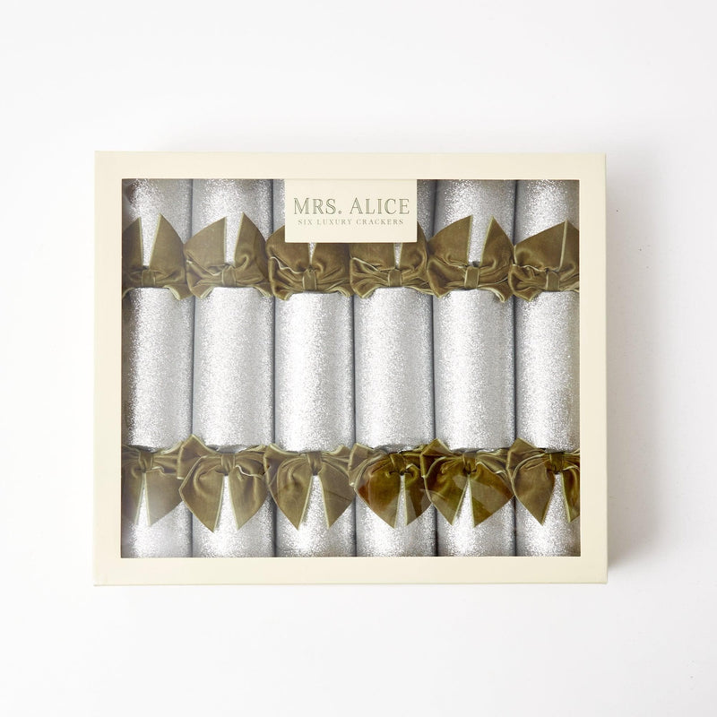Silver Glitter Crackers with Green Velvet Bow (Box of 6)