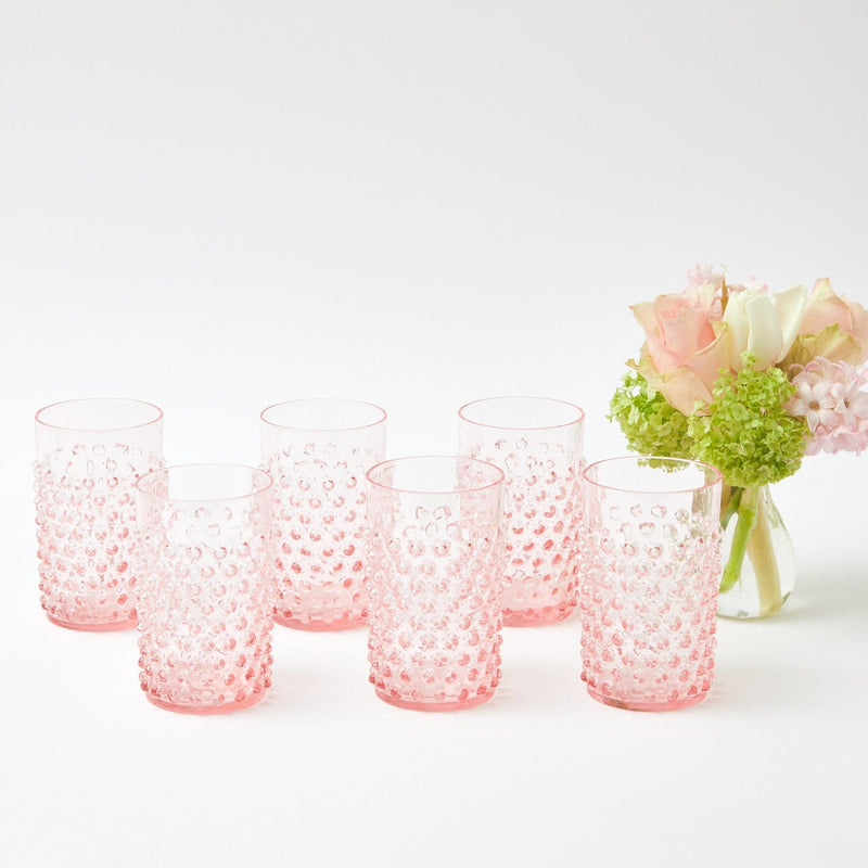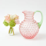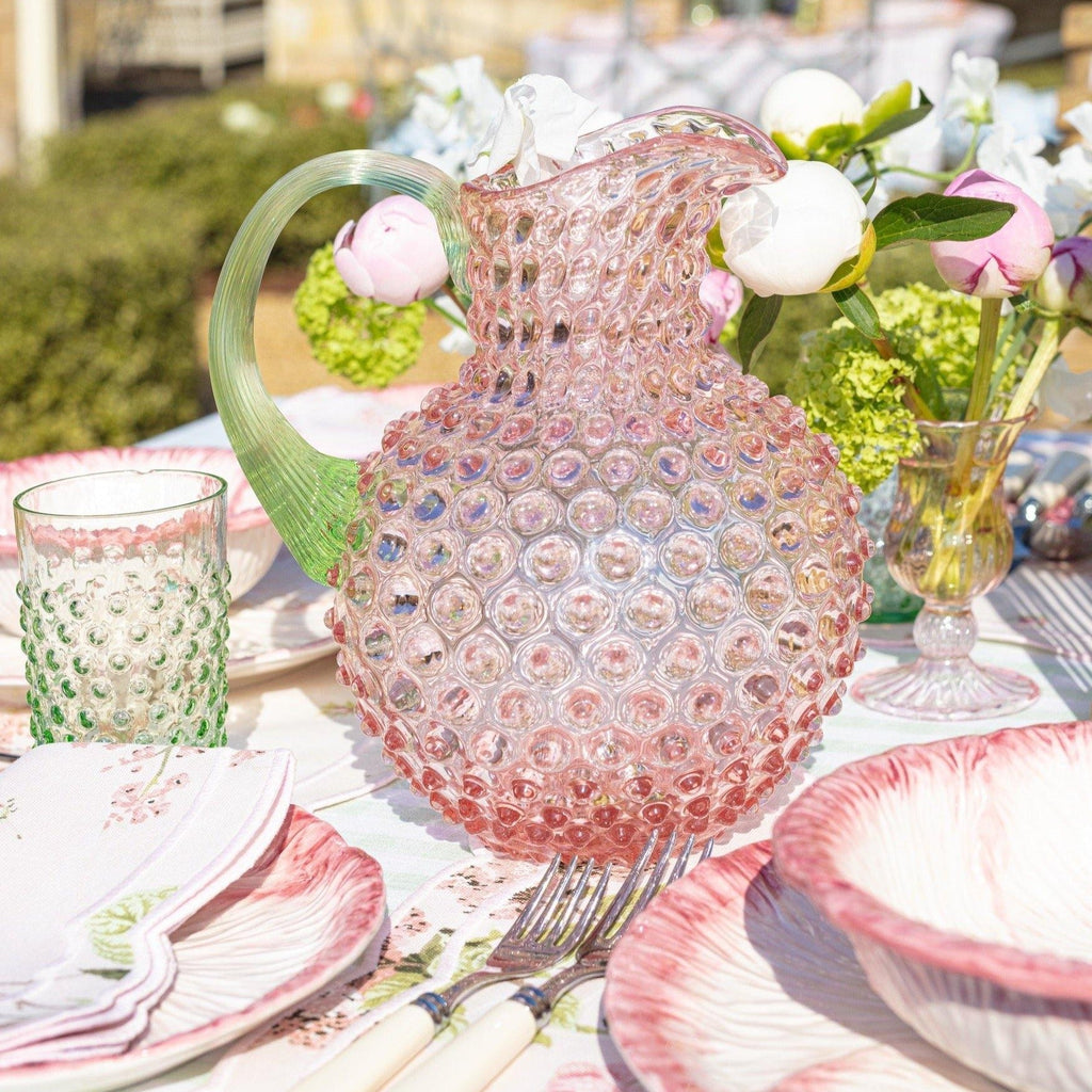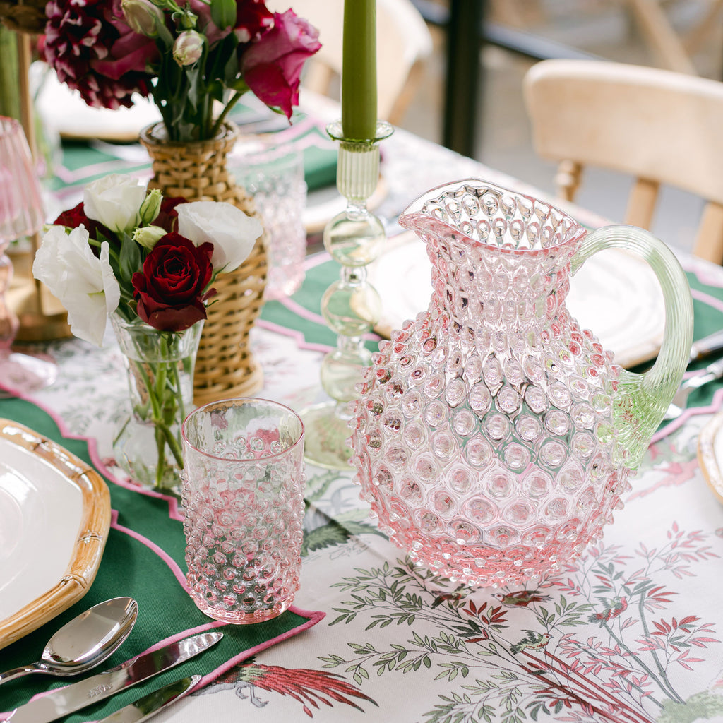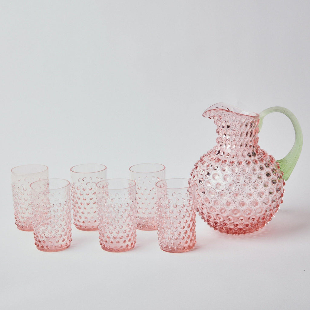 Our Rose Hobnail Jug with a beautiful emerald handle has been designed exclusively for Mrs. Alice. Made of pretty pink crystal glass with a hobnail texture, this set comes with 6 pink glasses and makes a beautiful statement on any Spring Table.