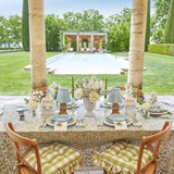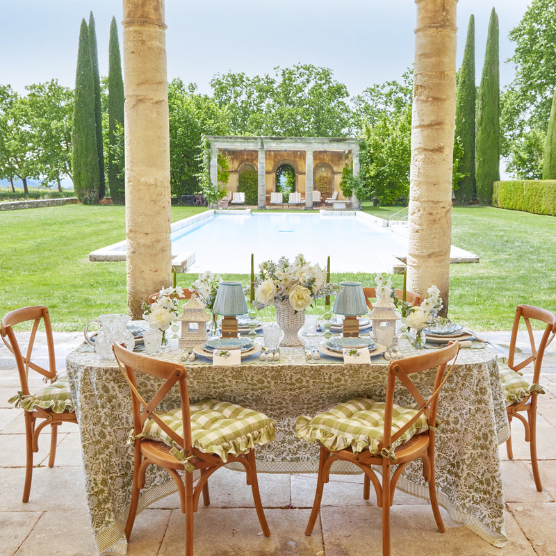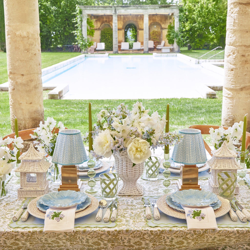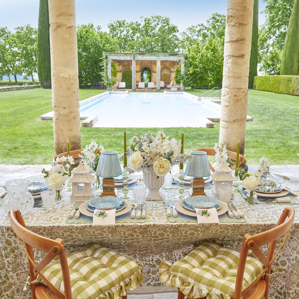 Elegant and chic, it features Serena Fresson's Lotus Flower Fabric in baby blue with a matching blue velvet trim.