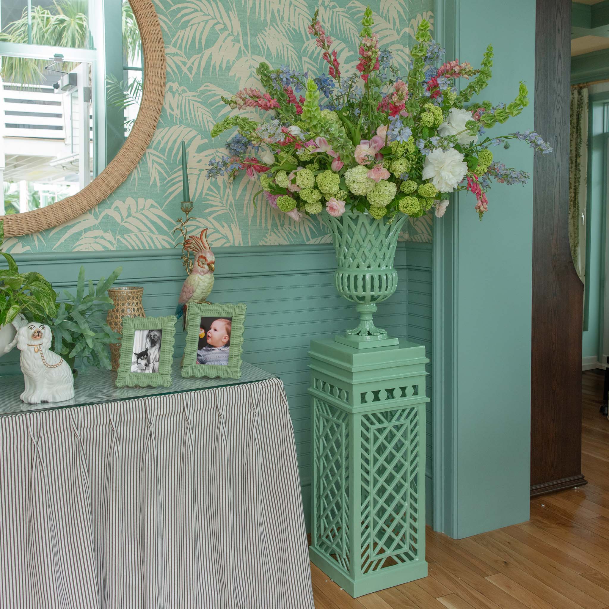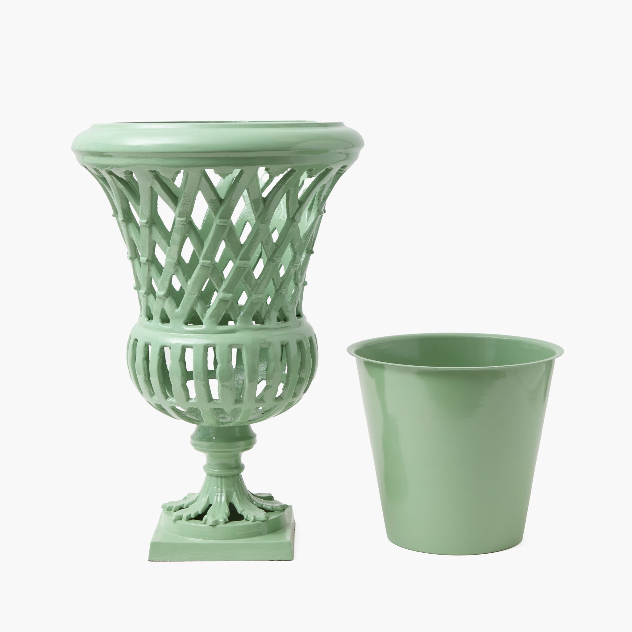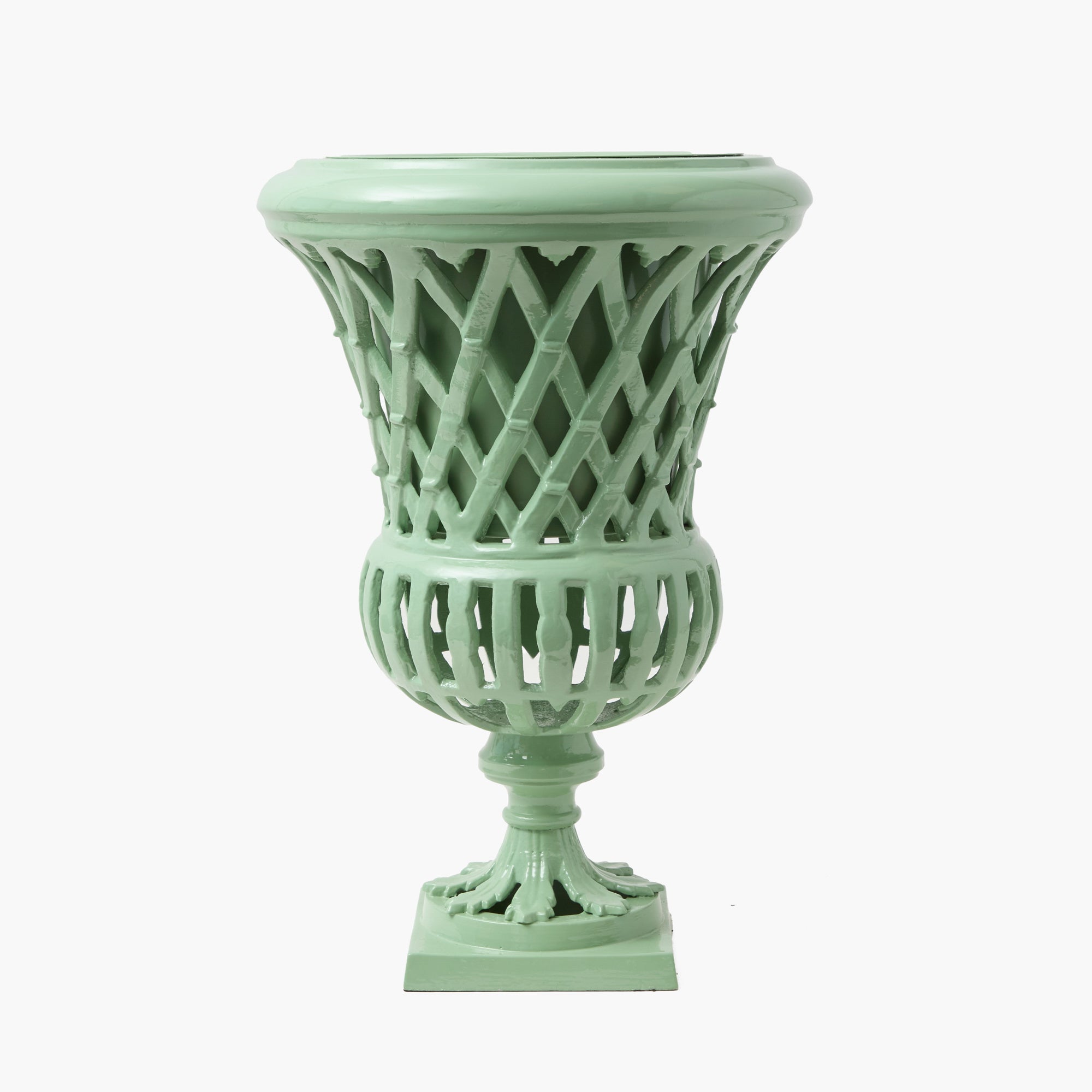 Create a glorious yet grand statement with our Adelaide Soft Green Lattice Urn & Pedestal. These two lattice pieces are crafted from durable aluminium and come in a soft, sage hue. The matching stand creates a sophisticated base that can be styled in entryways, garden rooms or on a terrace.