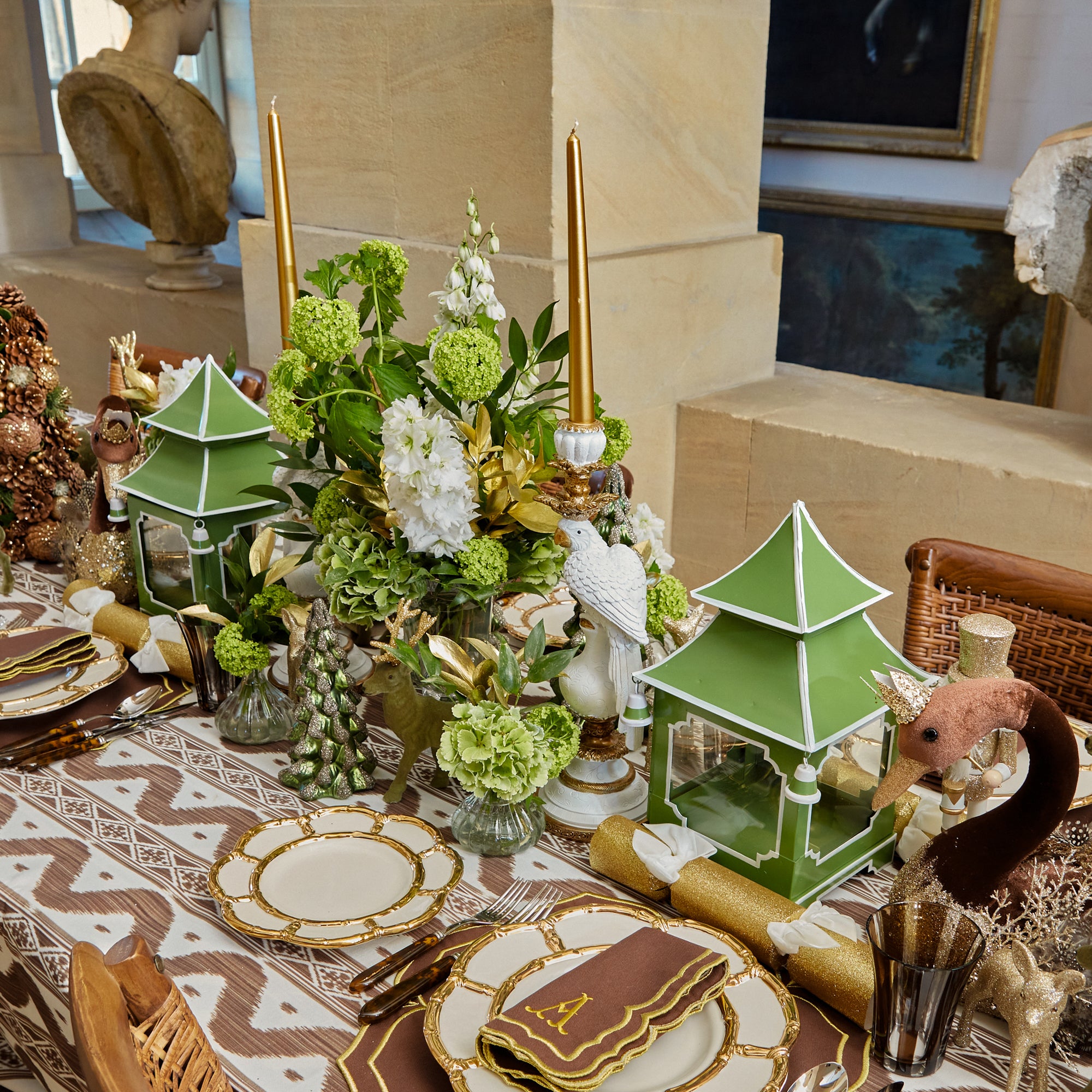 Add ambient lighting to your table with our delightful pair of Apple-Green Mini Pagoda Lanterns. These small metal and glass pagodas are designed in a timeless apple green and feature white accents. Use yours with either wax tealights or battery-operated LED candles.