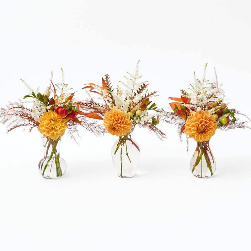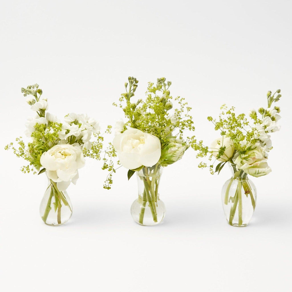Our delightful Ava Bud Vase Set is perfect for creating flourishing table accents this spring. Small and dainty these bud vases hold a small selection of stems of your choice, with unique handblown shapes for each of the three vases.