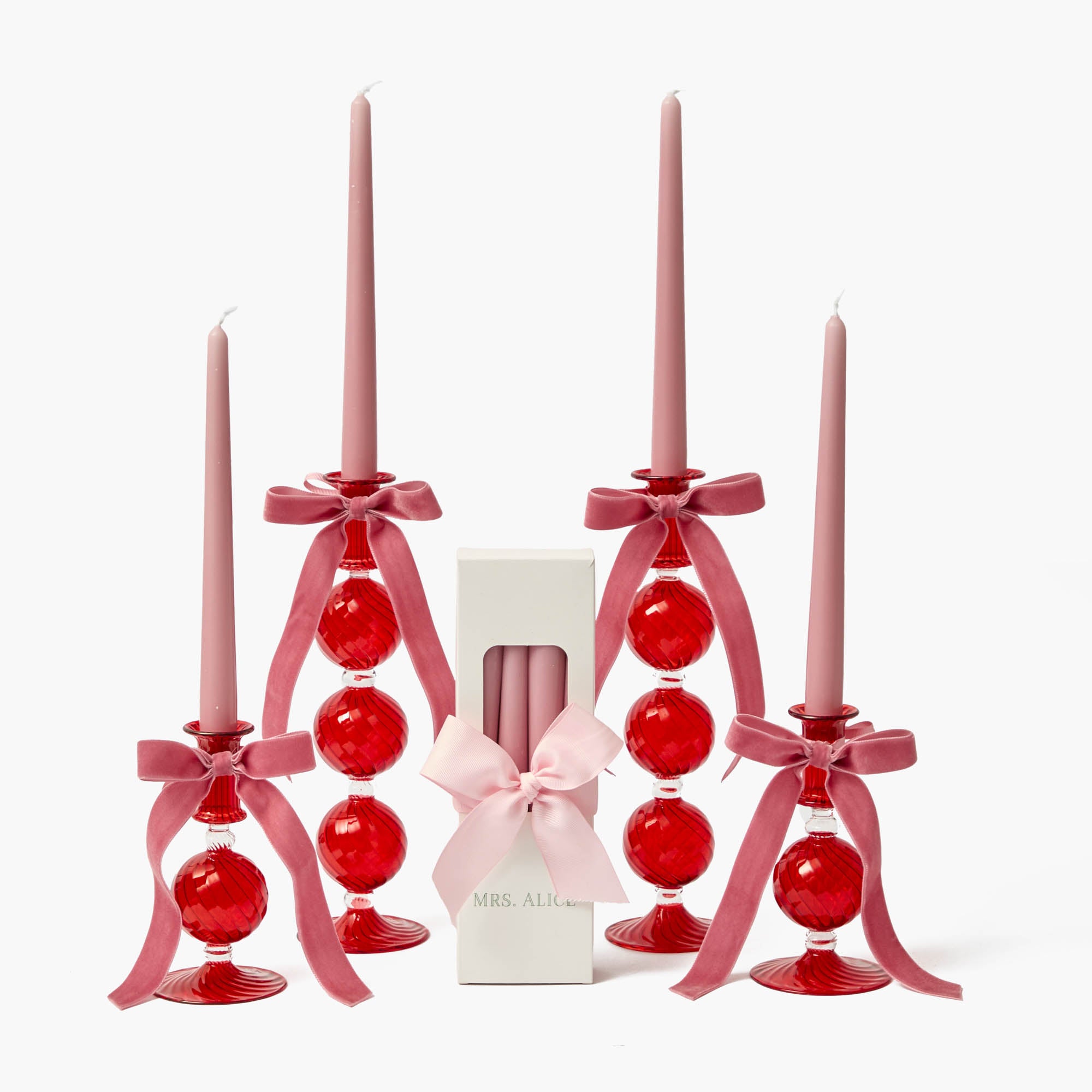 Add a soft glow to your intimate dinners with our Camille Red Ribboned Candle Set. This set of four offers you two different sizes of red glass candlestick holders, as well as a set of eight dusky pink candlesticks.