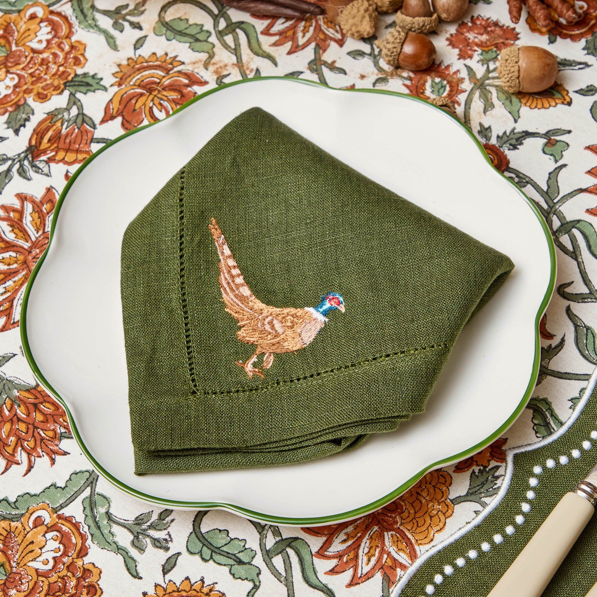 Our Eloise Forest Green Linen Placemats & Pheasant Napkins set is an ode to the countryside where Alice grew up. Each piece comes in the stunning forest green that will blend with both your daily dinnerware as well as your special occasion sets. While the placemats have been signed off with a dual white border, our napkins feature an embroidered pheasant.
