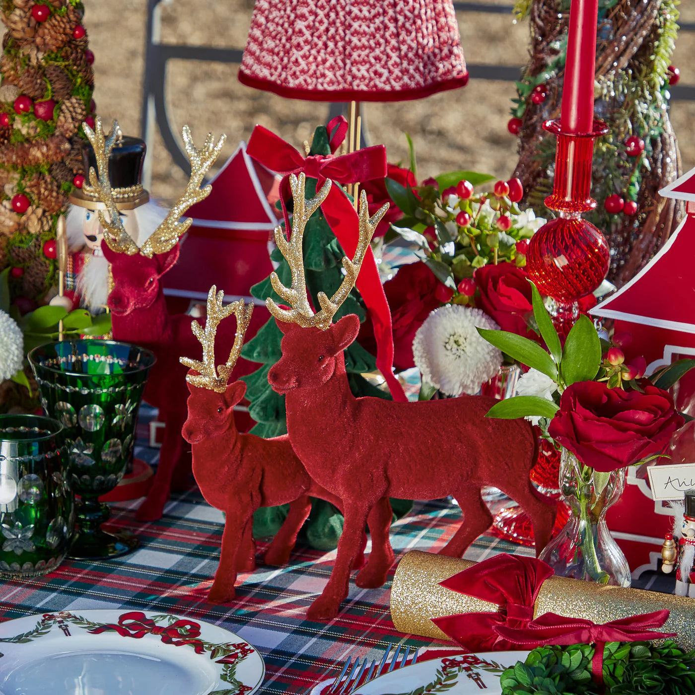 This Flocked Reindeer Family come in a bold burgundy red with gold glitter antlers.