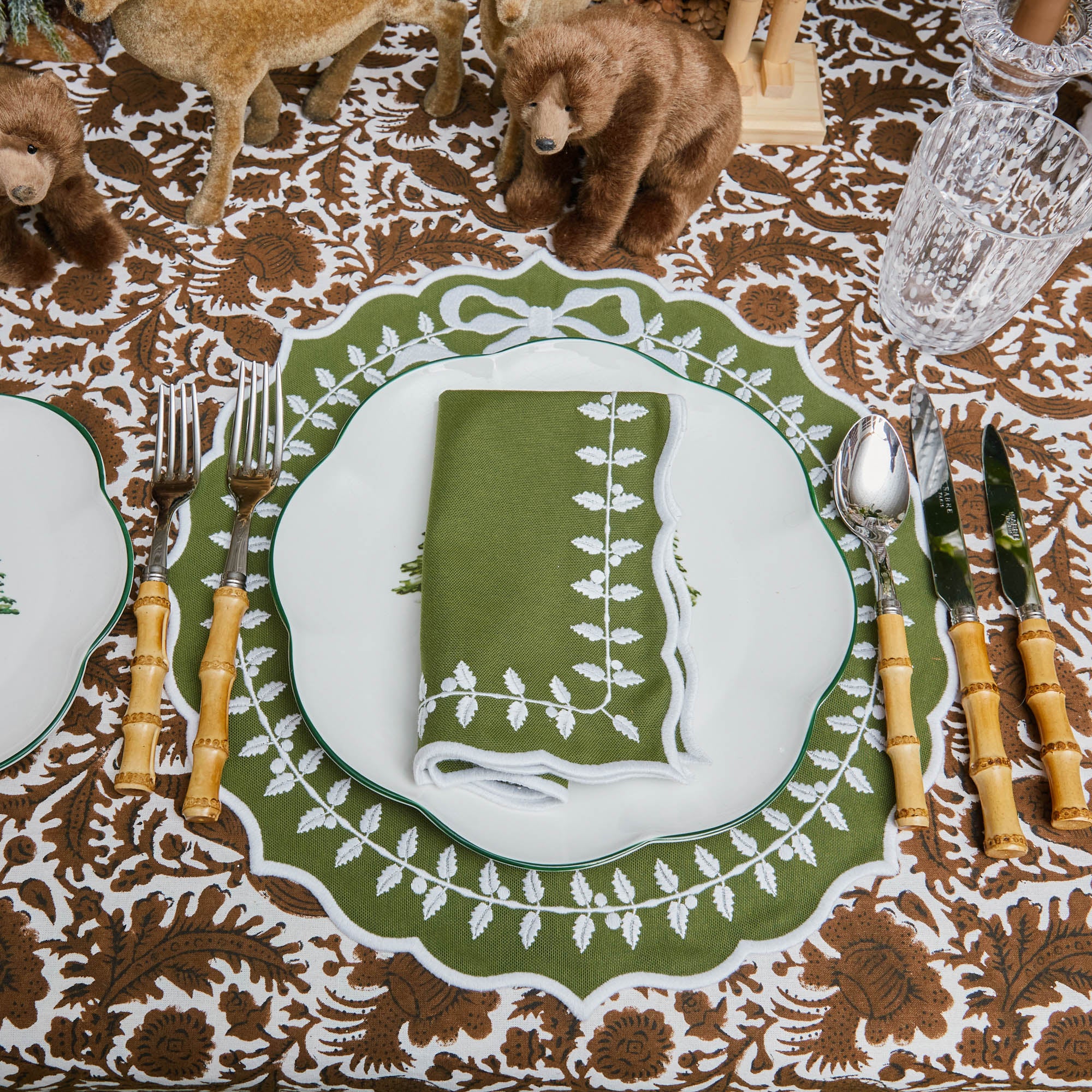 Add a touch of sophistication to your table settings with season with our Green Bow Laurel Napkins. This set of four is crafted in rich olive green and embellished with intricate trims and a white laurel embroidered border. Well-suited to both everyday meals and festive gatherings, these pieces will not only uplift your tableware but also create an inviting atmosphere for your guests.