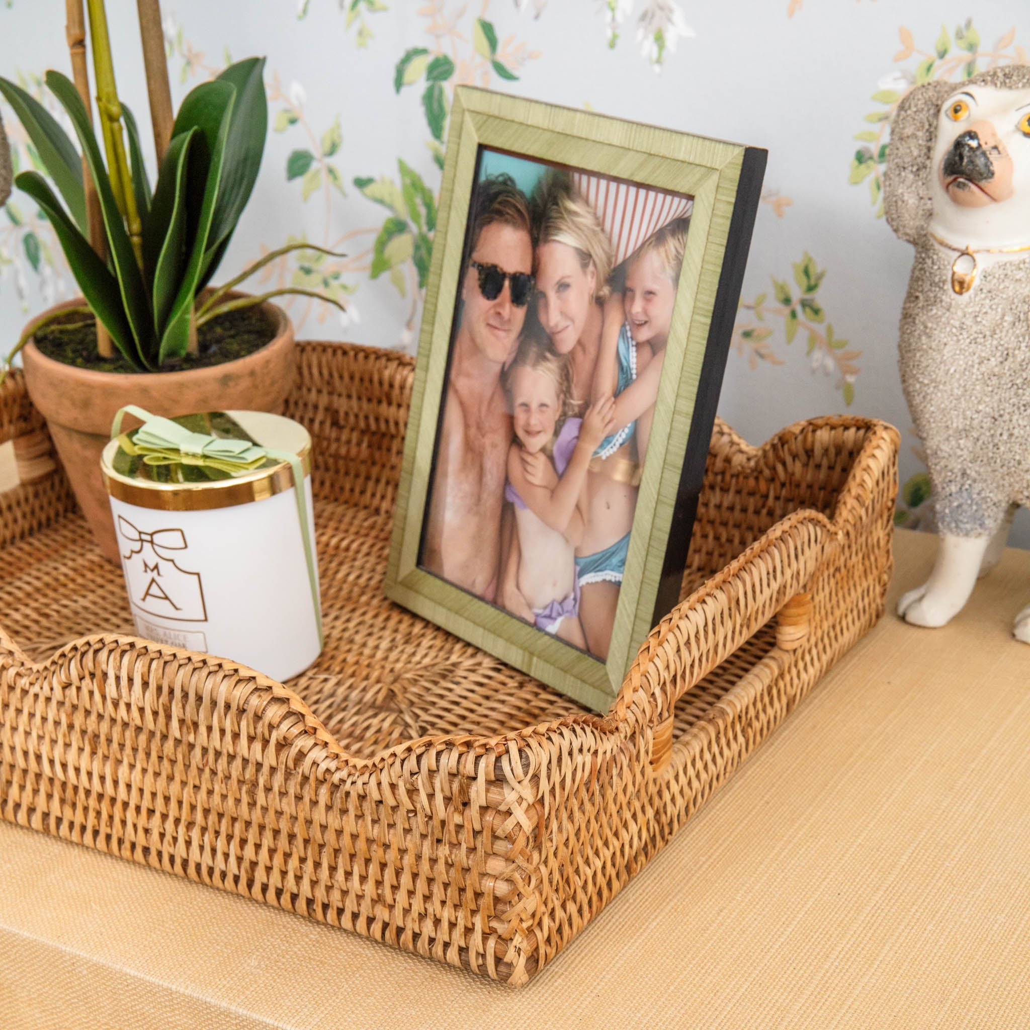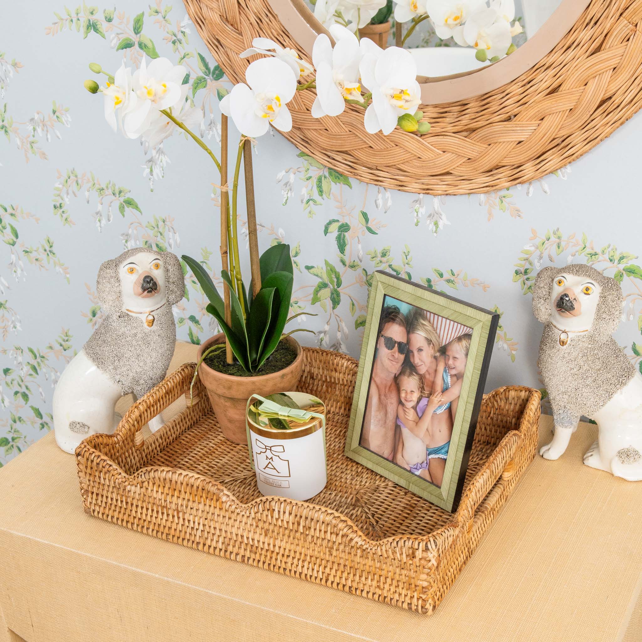 Our Natural Medium Rattan Tray is a versatile piece that will serve both your tabletops and your hosting needs. It's been hand-woven by our skilled artisans and includes a soft, scalloped trim and carrying handles. Its rustic aesthetic makes it perfect for blending in with both indoor and outdoor settings.