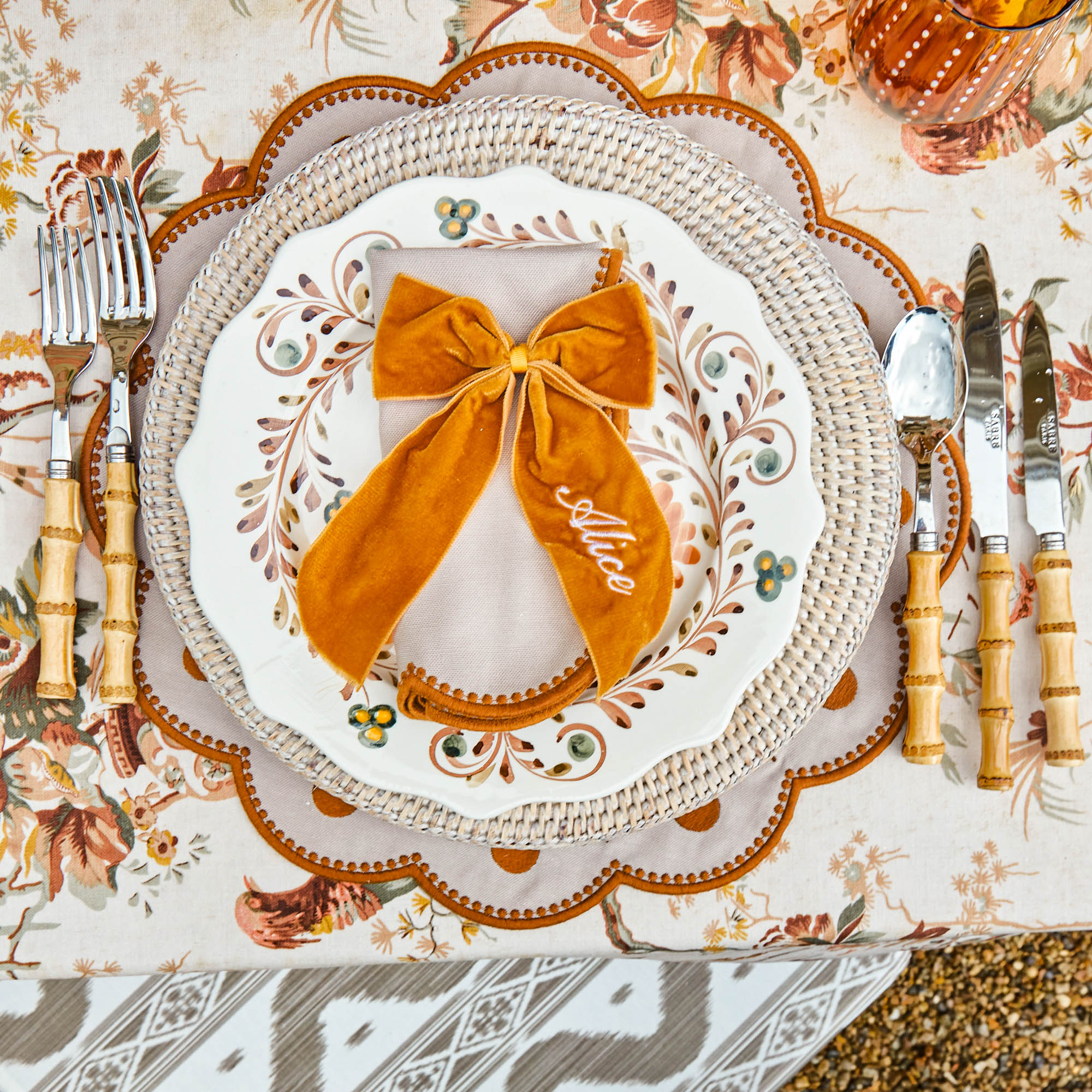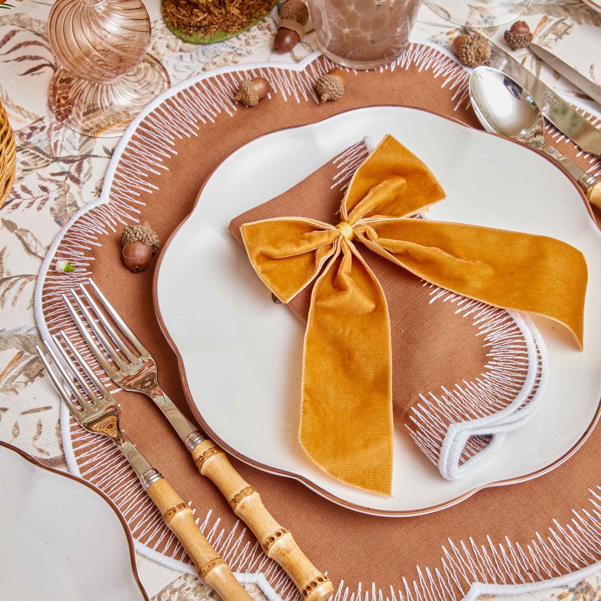 This enchanting personalised Napkin Bow in warm Mustard Yellow brings an elegant glow to your autumn table setting. Crafted from sumptuous velvet, it gracefully adorns napkins, candle holders, or festive décor, adding a charming and versatile accent to your seasonal celebrations.