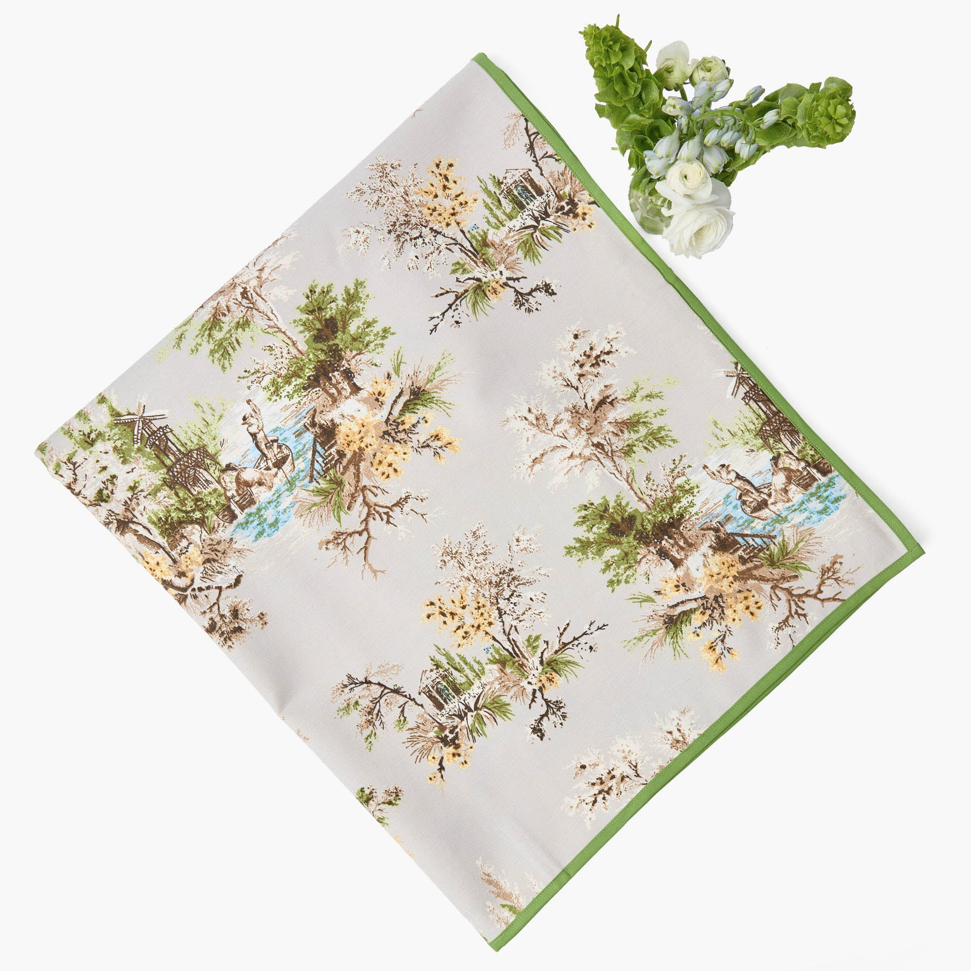 Our delightful Putty Windsong Tablecloth will be a welcomed addition to your dining space. This understated pieces features an intricate windsong motif and vibrant green trims, perfect for hosting formal dinners as well as casual brunches.