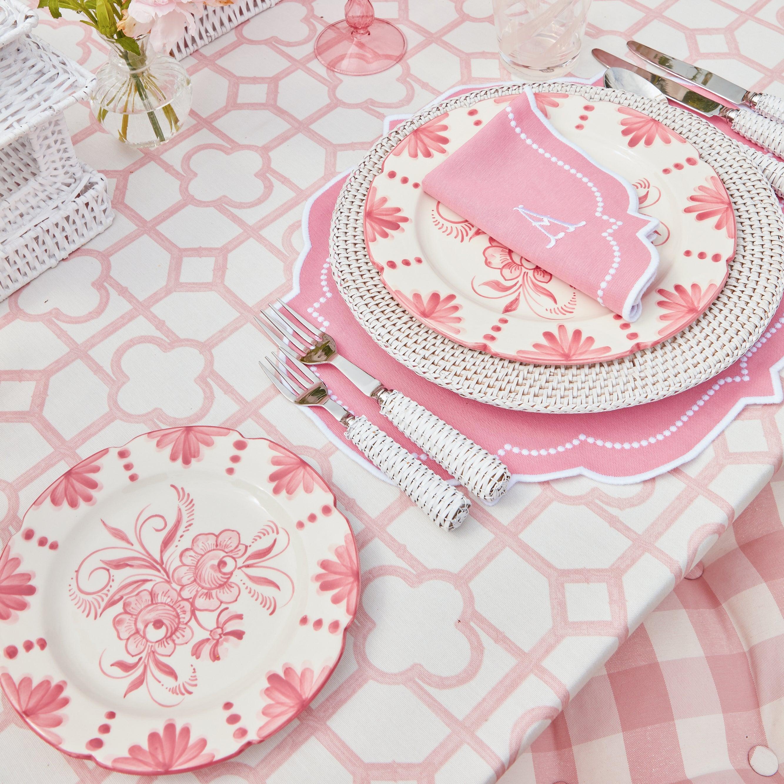 This ceramic Seville Gardênia Dinner Plate, exclusively designed for Mrs. Alice, is hand painted with a beautiful floral motif in dusty pink.