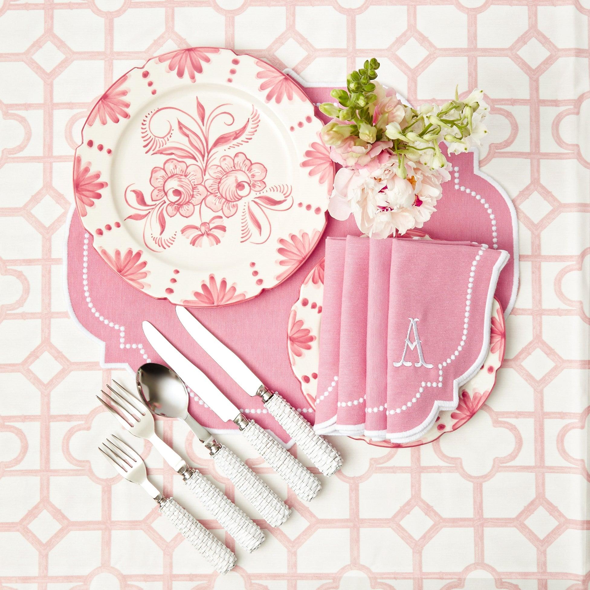 Created in a unique shape designed with delicate cut outs, this attractive dinner plate can be laid with the matching Seville Pink Gardenia Starter Plate, Pink Appliqué Linen and Ivory Cutlery.
