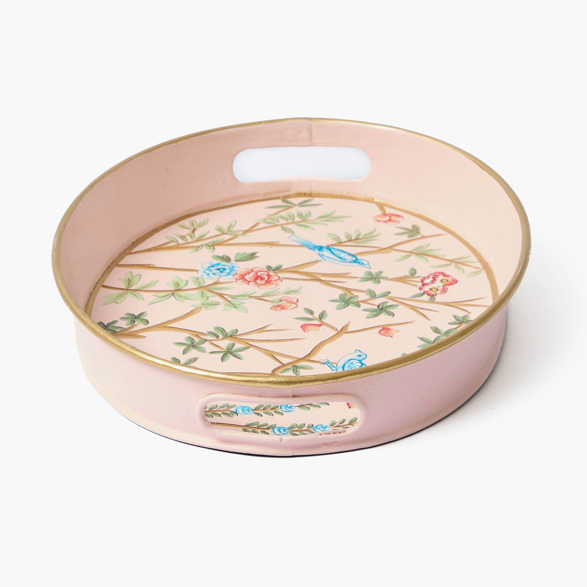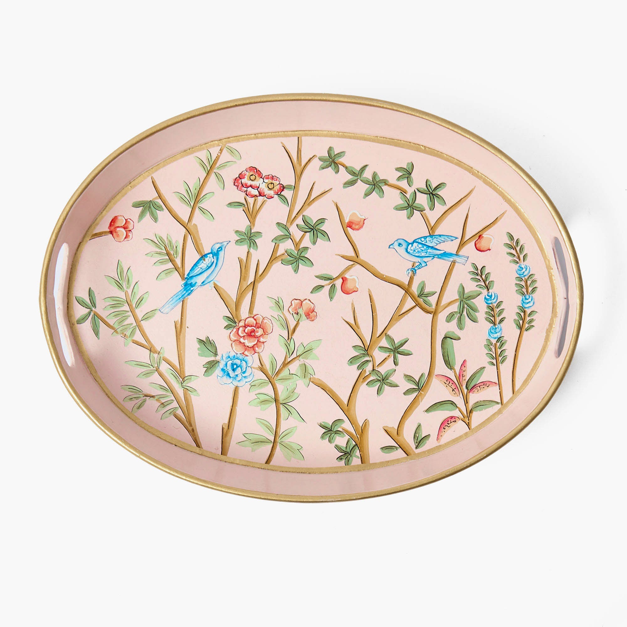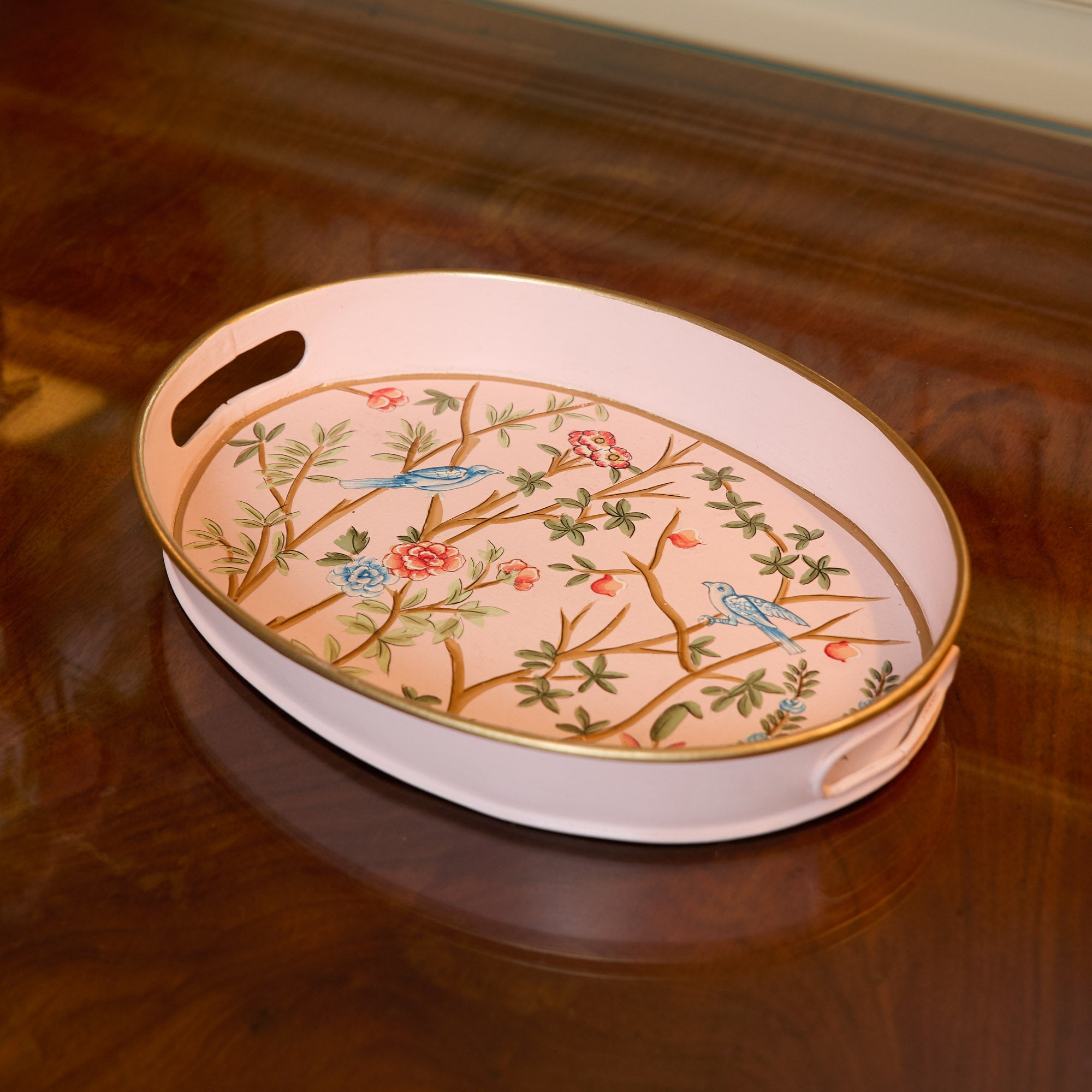 Our Small Pink Oval Chinoiserie Tole Tray seamlessly blends timeless style with intricate design. At the heart of this piece is an elegant floral pattern that will help elevate any room with its refined beauty.