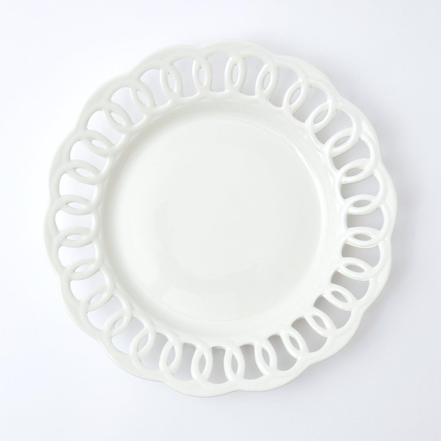 Our elegant White Lace Dinner Plate adds a refined touch to your everyday. It is large enough to be used both as a dinner plate or charger. Its elegant lattice rim will elevate any table setting and can be used throughout the year.